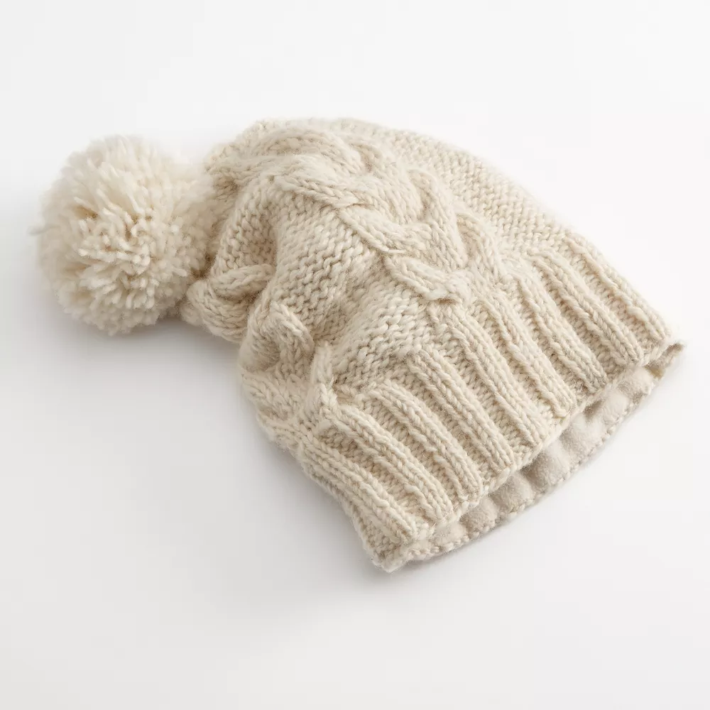 This cozy SIJJL cable-knit beanie features a long design with pom-pom accent on top. Make it easy to beat the cold with with ultrawarm wool and fleece-lined women’s hat. In ivory.