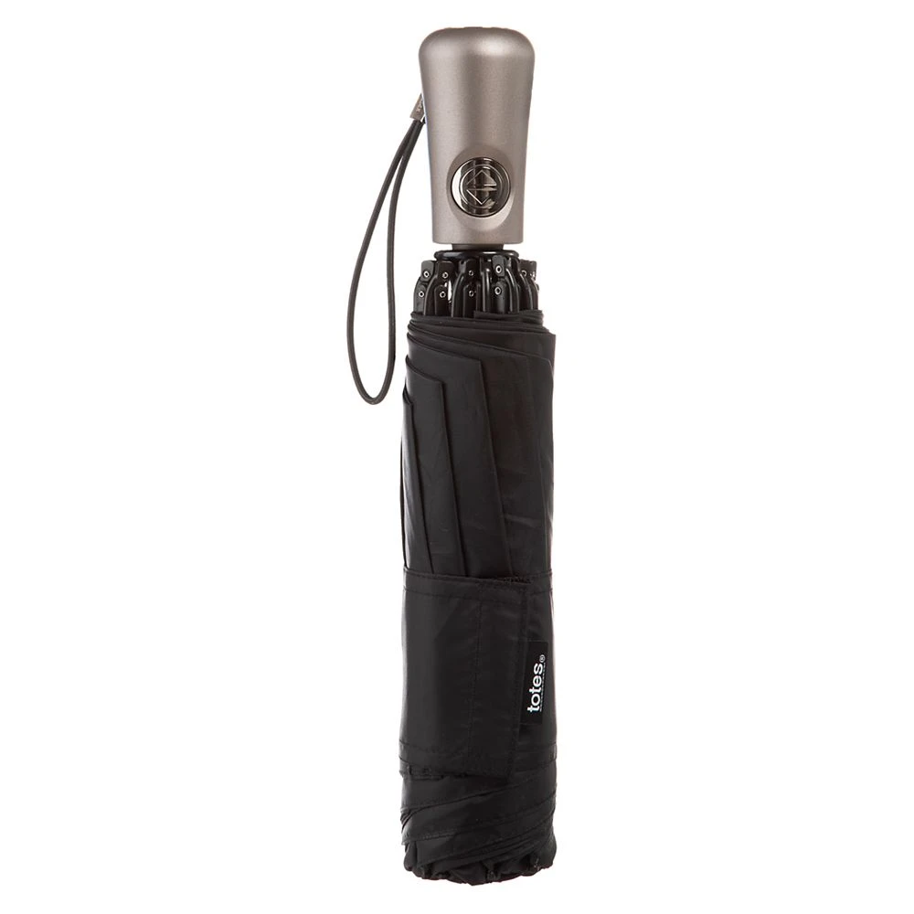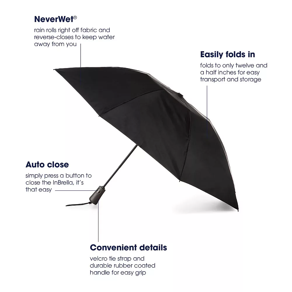- The totes Compact InBrellaFolds in. Keeps drips away.Don’t let ordinary folding umbrellas and their drippy messes win! Stay on the dry side with our smartly designed InBrella w innovation meets style. This extraordinary umbrella closes inside out, keeping water away from you. The auto open-close feature makes folding the umbrella a breeze with the press of a button; no more annoying wet clothes on trips in and out of the car. And, the quirky under-canopy prints will bring a permanent smile to your face on those dreary days. This new InBrella folds to just 12-1/2 inches, so it’s even easier to stash when you’re on-the-go.Reverse-Close Umbrella:Closes inside out, keeping water away from you.Auto Opens-Closes:Press to open. Press to close. It’s that simple.Colorful Prints:Cheery canopy prints that demand smiles. Water Resistant Invisible Coating: Rain rolls right off fabric so umbrella stays dry.Convenient Details: Velcro tie strap for easy, neat storage, durable metallic handle.Canopy size: 46-inches; folds to 12-1/2-inches when closed.Care: Leave open to dry. Wipe clean with a damp cloth.