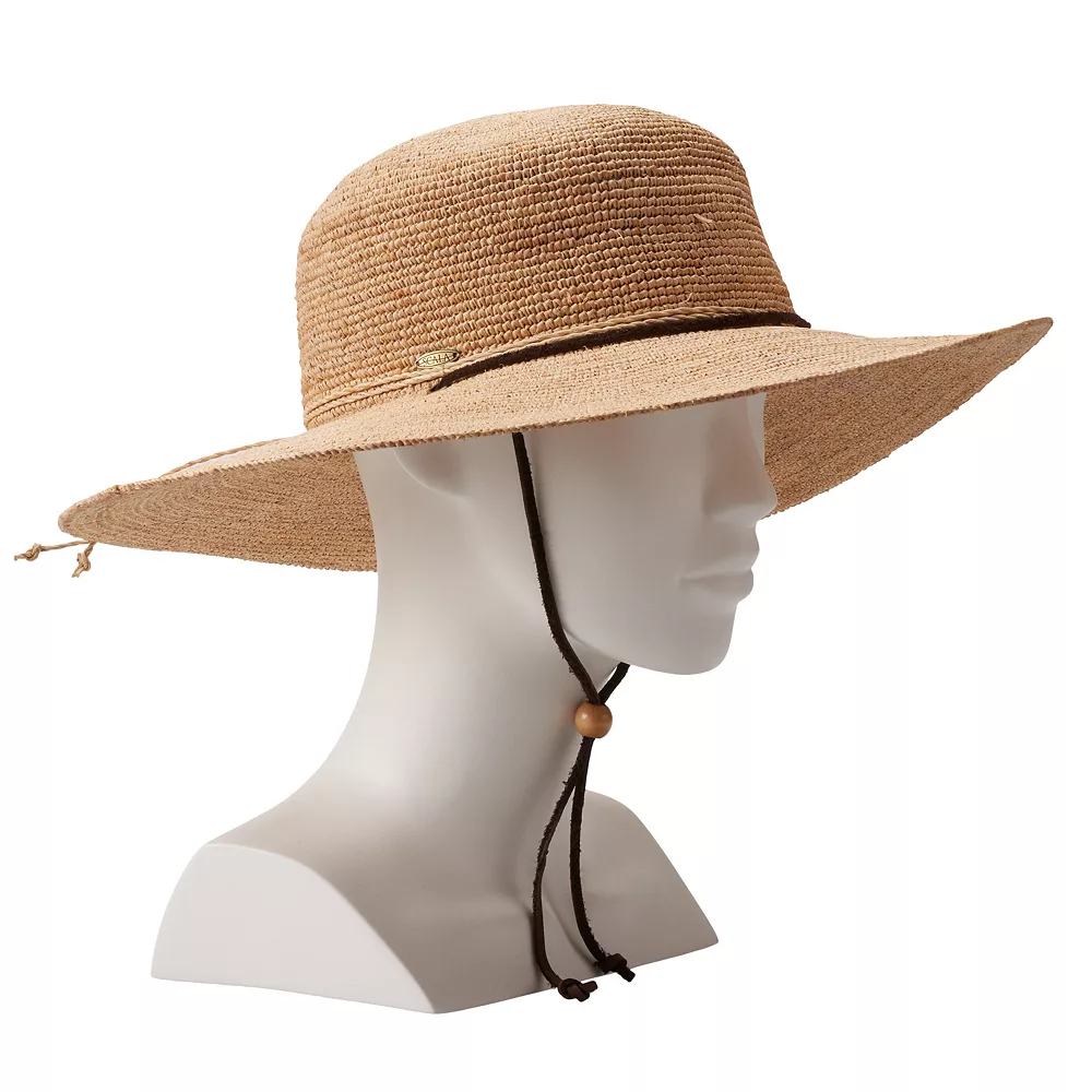 This women’s Scala raffia hat features a stylish and useful chin cord that keeps it in place on windy days.